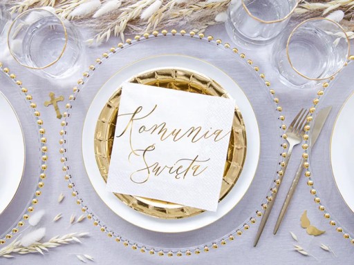 Polecamy obrusy jednorazowe, białe, złote, białe w złote groszki..., talerze, talerzyki (złote..) i sztućce (przezroczyste...), oraz w podobnej kolorystyce kubeczki. Oferujemy również duży wybór serwetek komunijnych i innych artykułów potrzebnych do urządzenia przyjęcia.