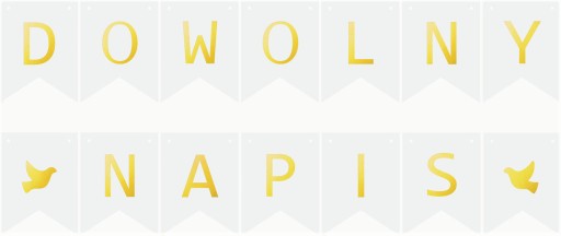 Piękny klasyczny baner na komunię składający się z 14 białych flag, delikatnie ozdobionych złotymi paskami, tworzących złoty napis I Komunia Święta. Dwa biało-złote gołąbki dołączone do banera, pięknie podkreślają charakter uroczystości.
