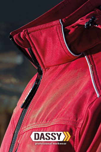Softshell Dassy zapewnia doskonałe dopasowanie. Wyposażony jest w regulowane mankiety zapinane na rzep oraz regulowany ściągacz w pasie. Dla wzmocnienia został podwójnie przeszyty. Kurtka przeciwdeszczowa zasuwana jest na zamek błyskawiczny z ochroną podbródka zapobiegającą przypadkowemu przycięciu. Elementy odblaskowe skutecznie zwiększają bezpieczeństwo podczas pracy. Kurtka robocza wyposażona jest w 2 zasuwane kieszenie przednie, kieszeń na piersi, kieszeń wewnętrzna oraz kieszeń na telefon komórkowy. Model ten zapewnia doskonałą swobodę ruchu, dzięki tkaninie rozciągliwej mechanicznie.