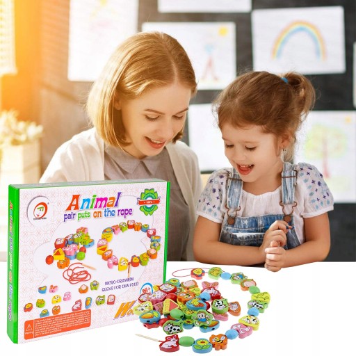 ✅ Zabawa polega na dopasowywaniu i nawlekaniu na sznureczek klocków, dzięki czemu dziecko rozwija umiejętności manualne i zręcznościowe.