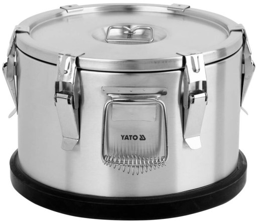masywne uchwyty ułatwiające transport oraz sześć zatrzasków zamykających pokrywę. Wysoka jakość i wytrzymałość tych elementów, gwarantuje wieloletnie bezawaryjne użytkowanie. Spód termosów YATO chroniony jest gumową osłoną, która zapobiega przesuwaniu się po podłożu w trakcie transportu. W termosie zastosowano specjalne wytłoczenia umożliwiające sztaplowanie, czyli piętrowanie pojemników o takiej samej średnicy, dlatego możliwe jest składowanie ich na stosunkowo niewielkiej powierzchni. Sztaplowane mogą być pojemniki o pojemności do 35L. Transport i przechowywanie żywności