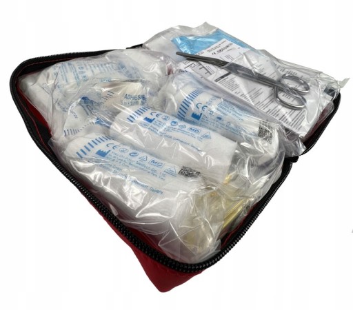 Elementy wyposażenia apteczki przechowywane są w sterylnie zamkniętych woreczkach, a całość zapakowana jest w solidne etui zapinane na zamek błyskawiczny.