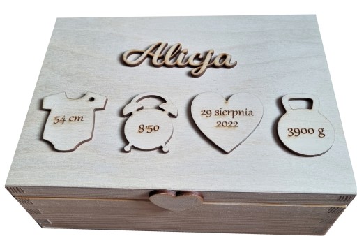 Oferujemy drewniane pudełko wspomnień z imieniem i metryczką dziecka z przegródkami wraz z wypełnieniem oraz kopertą zawiesząoną na klamerce na drobne wydatki