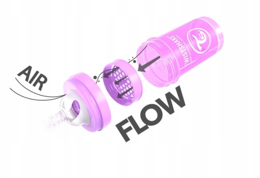 Butelka posiada unikalny system antykolkowy TwistFlow, który obejmuje zawór powietrza i siatkę mieszającą. Przeciwdziała kolkom stałym przepływem, który zapobiega przedostawaniu się niepotrzebnego powietrza do wrażliwego żołądka dziecka.
