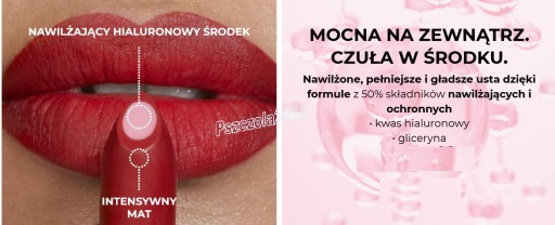 - Działanie: receptura z kwasem hialuronowym znakomicie nawilża i wygładza usta, nadając im elegancką, matową barwę