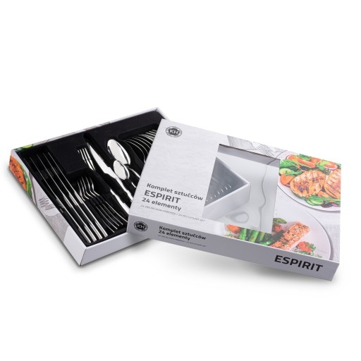 Komplet sztućców Espirit 24 elementy połysk, - 6 x nóż, długość: 23 cm, szerokość: 2 cm, - 6 x widelec, długość: 21 cm, szerokość 2,5 cm, - 6 x łyżka, długość: 21 cm, szerokość: 4,3 cm, - 6 x łyżeczka, długość: 14,3 cm, szerokość: 2,3 cm