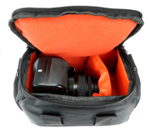 Torba pomieści średniej wielkości aparat wraz z akcesoriami, takimi jak: