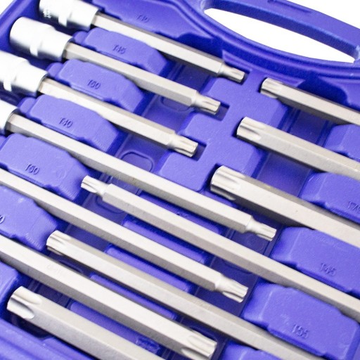 - 10 kluczy nasadowych o długości 100 mm, w rozmiarach T20, T25, T27, T30, T40, T45, T50, T55, T60 i T70;