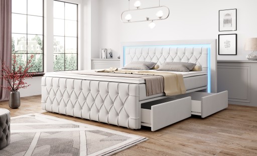 Kompletne łóżko kontynentlane AROSA z materacami na 9-strefowej sprężynie kieszeniowej. Zagłowie łóżka z oświetleniem LED oraz ozdobnym pikowaniem Chesterfield.