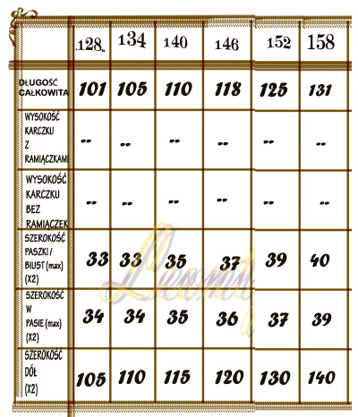 - Przed zakupem należy zmierzyć dziewczynkę i sugerować się tabelą wymiarów