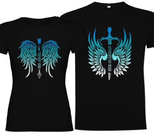 SUPER FAJNY, NIEPOWTARZALNY PREZENT DLA ZAKOCHANYCH NA ROCZNICĘ, WALENTYNKI Z NAPISAMI: HER GUARDIAN na męskiej koszulce i HIS ANGEL na damskiej koszulce