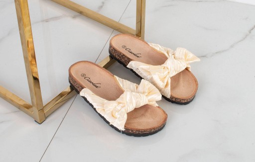 Klasyczne klapki z ekoskóry z kokardą. Obuwie na płaskiej podeszwie. Wygodne i uniwersalne, sprawdzą się na upalne i słoneczne letnie dni!