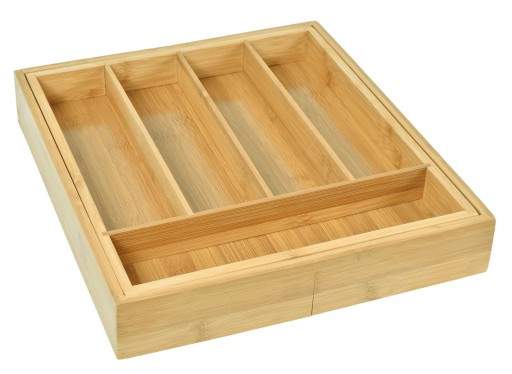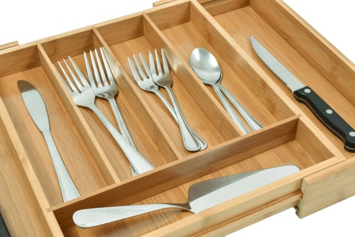 Praktyczny organizer na sztućce wykonany z naturalnego bambusa. Dzięki właściwościom materiału bambusowego pozostaje odporny na wilgoć i odkształcenia. Organizer bambusowy jest bardzo pojemny. Ma aż 7 praktycznych przegród, pięć na sztućce i dwie dodatkowe na noże i większe przybory kuchenne. Organizer bambusowy jest rozkładany, boczne przegrody można w razie potrzeby wsunąć do środka i zaoszczędzić cenną przestrzeń. Dzięki niemu w szufladach kuchennych zapanuje ład i porządek. Jego kompaktowe wymiary sprawiają, że będzie pasował do większości standardowych szuflad.