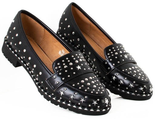 Wyjątkowe mokasyny ze skóry ekologicznej na profilowanej, płaskiej podeszwie. Piękna, głęboka czerń kolor oraz efektowne ozdoby w postaci ćwieków. Model solidnie i starannie wykonany. Obuwie idealne do tworzenia najmodniejszych stylizacji!