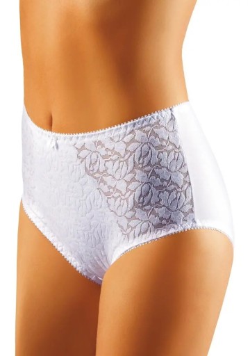 Wygodne i komfortowe majtki, wykonane z miękkiej dzianiny bawełnianej (94%) i elastynu (6%), z przodu ozdobione szeroką koronką o motywie kwiatowym na biodrach, od wewnętrznej strony środkiem podszyte bawełnianą wstawką - opinającą tkaniną, która pełni funkcję podtrzymującą – są absolutnym hitem naszej kolekcji. Koronka sprawia, że bielizna dodaje kobiecie niesamowitego uroku i seksapilu. Fason mocniej zabudowany sięgający do pępka, idealnie dopasowuje się do każdej sylwetki, doskonale się prezentując. Na środku u góry znajduje się naszyta, zmysłowa, mała kokardka, nadająca desu dodatkowego uroku. Figi te są eleganckie, ale równocześnie klasyczne – pasują do różnych osobowości. Rozmiary: M-XXXL, kolory: biały, czarny, beż.