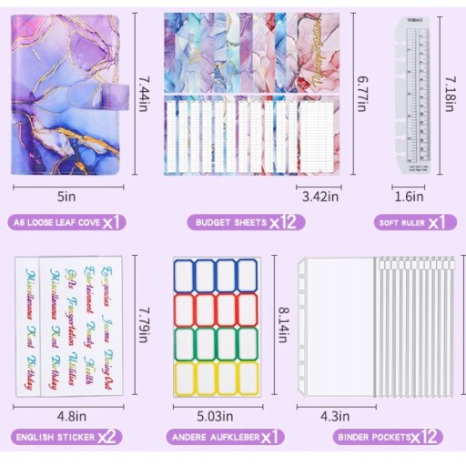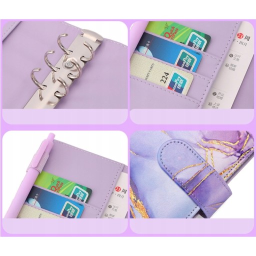 Planer budżetu jest dostarczany z notatnikiem A6 ze skóry PU z 6 pierścieniami (w tym 3 miejsca na karty, 2 szlufki na długopisy, 2 boczne kieszenie), 12 budżetowych kopert do segregatorów, 12 arkuszy budżetowych, 2 naklejki angielskie, 1 małą naklejkę z etykietą, 1 przezroczystą linijkę, ekonomiczny segregator można bez problemu przenosić i robić notatki.