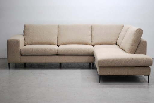 Narożnik jest fabrycznie nowy wykonany z wysokiej jakości tkaniny,boucle która jest bardzo przyjemna w dotyku. Wypoczynek jest w kolorze cappuccino. Kanapa stoi na nowoczesnych nóżkach.
