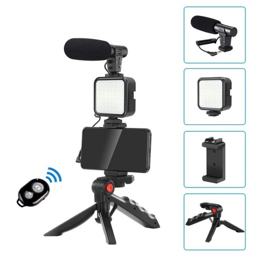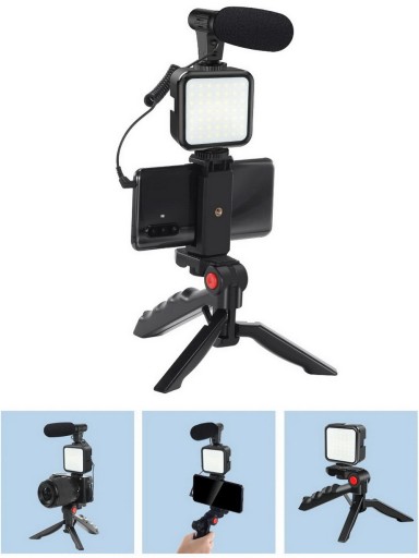 Zestaw do nagrywania filmów zawierający statyw w uchwytem, lampę LED, mikrofon, pilot oraz mocowanie na telefon
