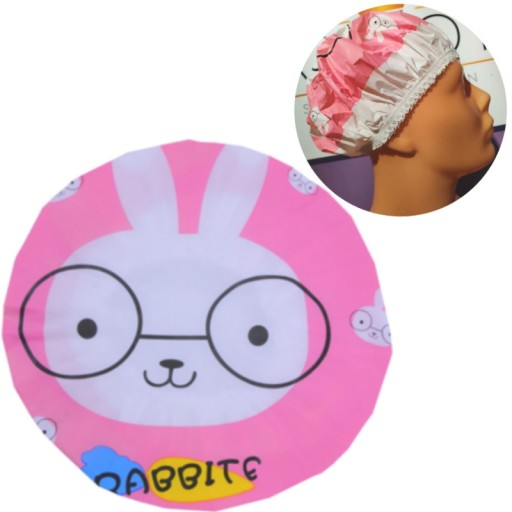 Kolorowy czepek do masek i pod prysznic z nadrukiem króliczka. Nieprzemakalny materiał idealnie sprawdzi się jako ochrona przed zmoczeniem włosów podczas prysznica czy kąpieli.