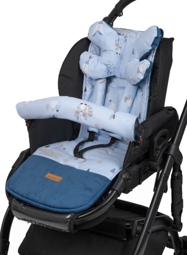 Wkładka posiada 6 otworów na pasy bezpieczeństwa, oraz dwa otwory na zamocowanie poduszki motylka. Wkładki są uniwersalne testowane na wielu wózkach dziecięcych dostępnych na rynku.