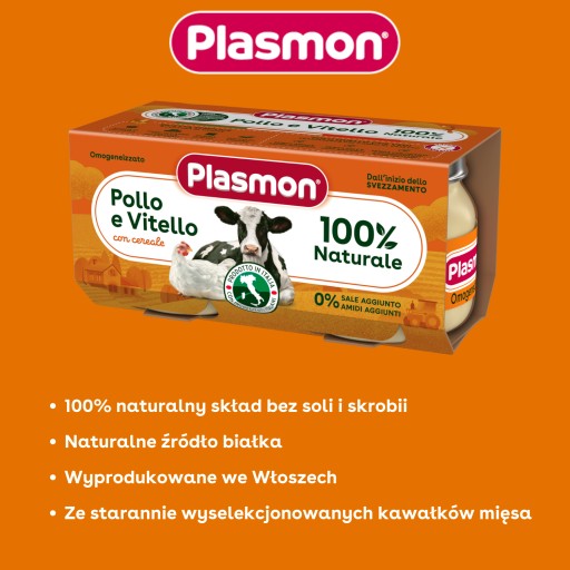 Sterylizowany dodatek Plasmon z kurczakiem i cielęcinką produkowany jest według 100% naturalnej receptury, co oznacza, że w słoiku nie znajdziesz dodatku soli, skrobi, barwników ani konserwantów. Mięso jest bardzo ważnym elementem diety dziecka. Dania z mięsa Plasmon dostarczają Twoim dzieciom wszystkich białek zawartych wyłącznie w mięsie. Nasze dodatki mięsne są również bezglutenowe. Odpowiednie od ukończenia 4 miesiąca życia, jeśli pediatra nie zaleci inaczej.