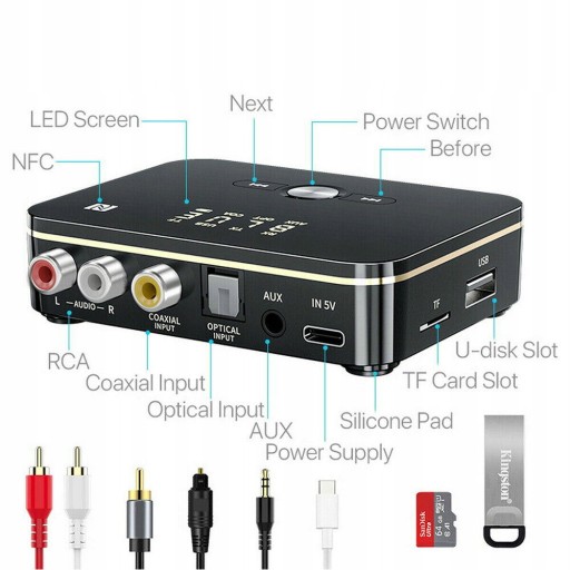 wbudowany układ cyfrowo-analogowy, obsługuje gniazdo 3,5 mm AUX, Cinch, cyfrowy optyczny, koncentryczny, USB (karta pamięci), interfejs TF. W zestawie kabel AUX, kabel RCA, kabel ładujący USB, może spełnić wszystkie wymagania dotyczące połączenia i spełnić różne urządzenia audio z funkcją Bluetooth i inną niż Bluetooth