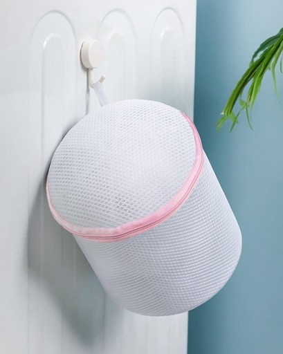 Materiał, z którego został wykonany worek to miękka siateczka, usztywniana plastikowym stelażem, która jest szybkoschnąca. niedługo po praniu można schować koszyk w odpowiedni miejsce. Dodatkowo koszyczek posiada zamek błyskawiczny, który pozwala na szybkie jego otworzenie lub zamknięcie.