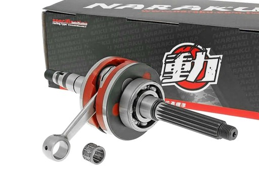Mieloch Motocykle oferuje Państwu wał korbowy firmy Naraku.Wał korbowy Kit Naraku HPC (High Primary Compression) to zestaw zawierający pełny wał Naraku HPC oraz zestaw dwóch łożysk wału z metalowym koszykiem renomowanej firmy NTN. Zestaw dostosowany do cylindrów tuningowych o pojemności 70cc z poziomu Sport oraz Racing. Wał Naraku HPC dostarczany jest z polerowanym korbowodem i dodatkowo łożyskiem korbowodu w zestawie. Znacznie zmniejsza pojemność skrzyni korbowej i zwiększa kompresję, co pozwala konkretnie zwiększyć osiągi.