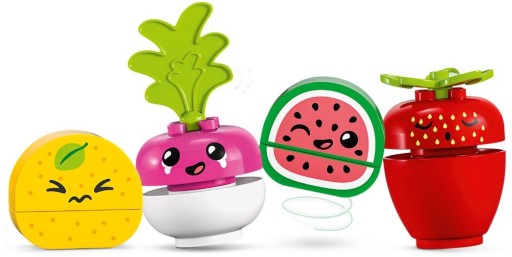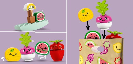 Dzieci mogą dowiedzieć się, na czym polega równowaga, układając zabawkowe owoce. Wszystkie zestawy LEGO® DUPLO® zaprojektowano z myślą o wyrażaniu siebie – w tym zestawie każdy produkt ma inną minę, aby zachęcić dzieci do kreatywnej zabawy!