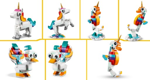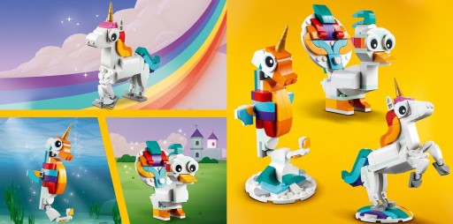 Dzięki trzem różnym magicznym stworzeniom, które mali konstruktorzy mogą złożyć w ramach zabawy tym zestawem LEGO Creator 3 w 1, mityczne przygody nigdy się nie kończą. Dzieci mogą zbudować ruchomego magicznego jednorożca, przerobić go na konika morskiego na podstawce imitującej dno morskie lub zamienić go w ruchomego magicznego pawia z kolorowym ogonem, a nawet użyć klocków do stworzenia zupełnie innego uroczego stworzenia.