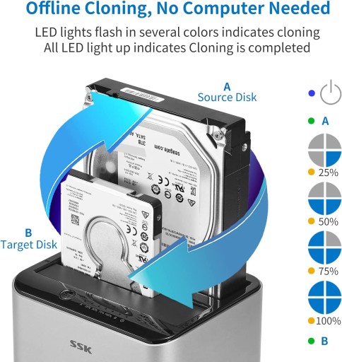 - 【Klonowanie offline】Stacja dokująca dysku twardego SSK obsługuje funkcję duplikatora klonowania offline, może być używana do klonowania istniejącego dysku twardego bez podłączania do komputera, łatwe do duplikowania danych z jednego na inny dysk twardy.