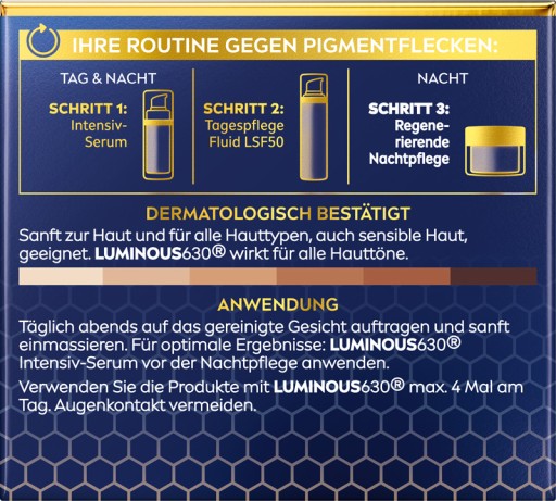 Odkryj NIVEA CELLULAR LUMINOUS630 Regenerujący krem na noc przeciw przebarwieniom, który zapewnia nocną regenerację skóry dzięki opatentowanemu składnikowi LUMINOUS630. Krem rozjaśnia istniejące przebarwienia i zmniejsza ich powierzchnię. Każdej nocy regeneruje i wzmacnia skórę dzięki formule z aktywującym komórki skóry* kwasem hialuronowym. Przy regularnym stosowaniu widocznie rozjaśnia przebarwienia i zmniejsza ich powierzchnię dzięki LUMINOUS630®. Rezultat widoczny jest już po 4 tygodniach. Produkt jest delikatny dla skóry i odpowiedni dla każdej karnacji oraz typu skóry, także wrażliwej. Tolerancja dla skóry potwierdzona dermatologicznie.