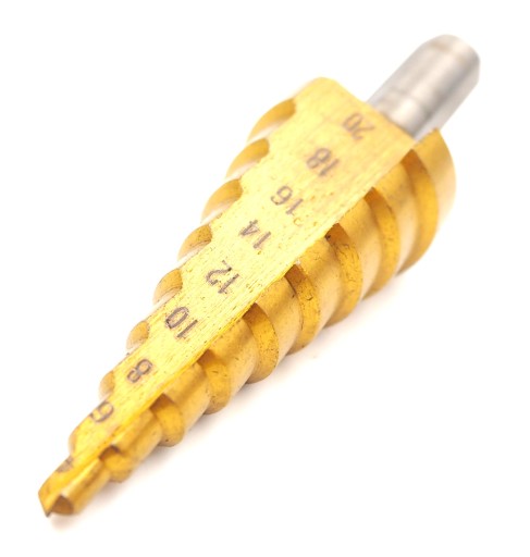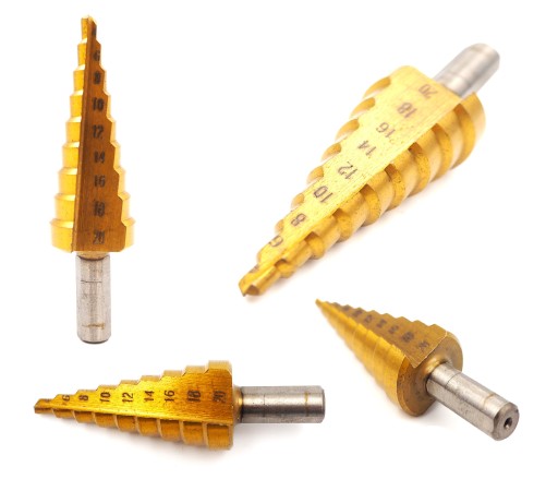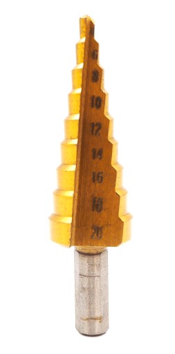 Wiertło stopniowe ze stali HSS powlekanej warstwą tytanu. Pozwala na wiercenie idealnie okrągłych otworów w
