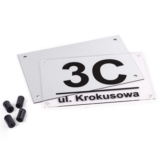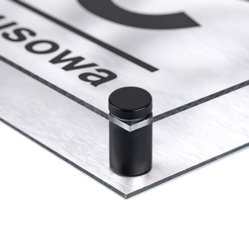 - Tabliczka wykonana jest z twardego rdzenia polietylenowego, stalowe dystansów montażowych, a także szkła akrylowego.