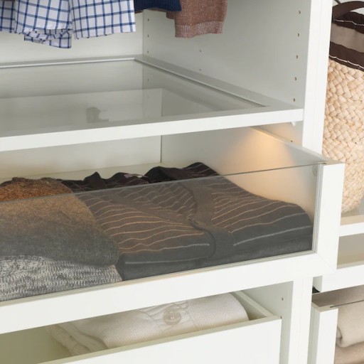 - Można uzupełnić szklaną półką KOMPLEMENT, aby zawartość górnej szuflady była widoczna od góry.