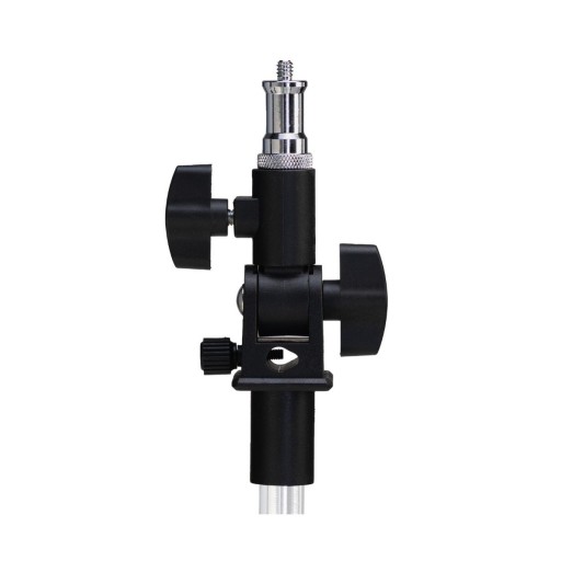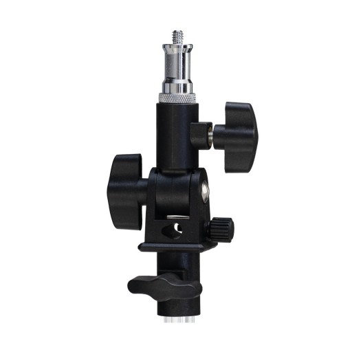 Quadralite tilt adapter do speedlite z mocowaniem parasolki to akcesorium, które ucieszy każdego fana strobbingu przy wykorzystaniu systemowych lamp reporterskich. Jest to adapter zakładany na końcówkę statywu oświetleniowego pozwalający regulować kąt pochylenia lampy. Dodatkowy adapter posiada mocowanie do parasolek z zabezpieczeniem. Końcówka adaptera jest obracana i wyposażono ją w gwinty montażowe o typowych średnicach 1/4" i 3/8".