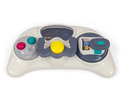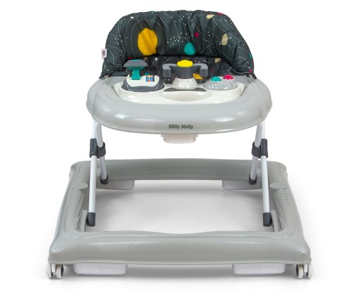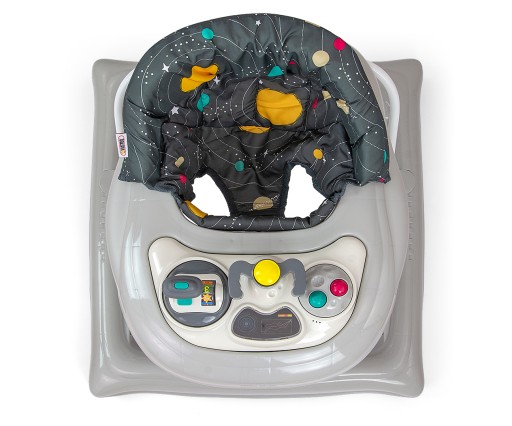 Produkt posiada edukacyjny panel, który zawiera szereg niespodzianek czekających na małych odkrywców: światełka, piszczałki, melodyjki, grzechotka, przyciski i inne ruchome elementy. Po wypięciu panelu z tacki chodzika posłuży on jako niezależna zabawka, np. jako umilacz w podróży, a blat przyda się jako stolik do zabaw.