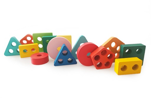 Zabawa polega na dopasowywaniu elementów tak, by otwory pasowały do danych drewnianych kołeczków.