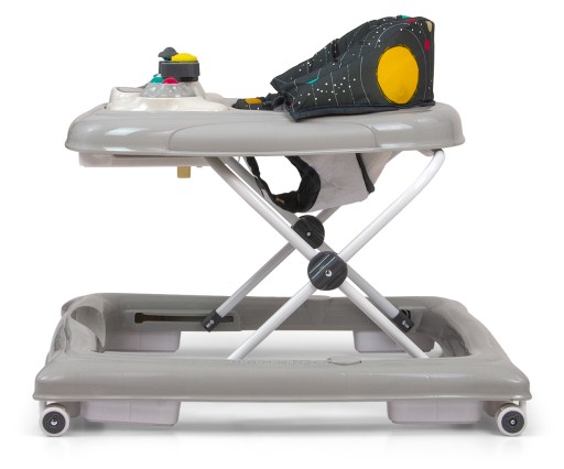 Produkt posiada edukacyjny panel, który zawiera szereg niespodzianek czekających na małych odkrywców: światełka, piszczałki, melodyjki, grzechotka, przyciski i inne ruchome elementy. Po wypięciu panelu z tacki chodzika posłuży on jako niezależna zabawka, np. jako umilacz w podróży, a blat przyda się jako stolik do zabaw.