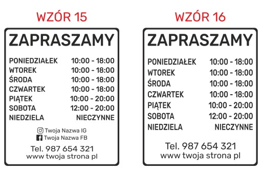 Wzór wiadomości: WZÓR 13 / PON. 9:00 - 21:00 WT. 10:00 - 21:00 ŚR. 10:00 - 21:00 CZ. 10:00 - 22:00 PT. 9:00 - 22:00 SO. 10:00 - 14:00 ND. NIECZYNNE / nazwa konta IG / nazwa konta FB / 987 654 321 / TWOJA STRONA WWW / KOLOR BIAŁY MATOWY