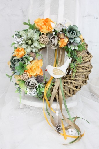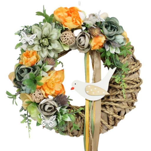 Wiosenny wianek wyplatany ze sznurka o średnicy 28cm udekorowany kwiatami astrów, pełnika i peoni.