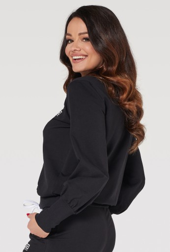- Swobodny krój z płytkim dekoltem został połączony z bufiastymi rękawami, które podobnie jak bluza w pasie, zostały wykończone szerokim prążkowanym ściągaczem.