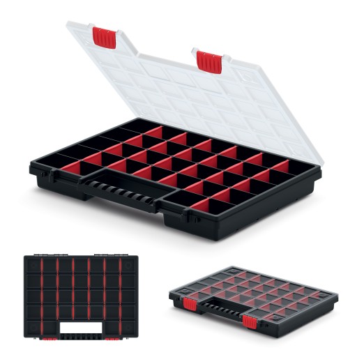 Organizer narzędziowy Nors 40 KNO40305S marki Kistenberg posiada 26 wyjmowanych przegródek, które ułatwiają układanie akcesoriów oraz ergonomiczny uchwyt zapewniający proste przenoszenie.