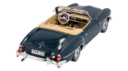 Nie jest to czysty samochód sportowy, ale bardziej sportowo-elegancki pojazd turystyczny i użytkowy: 190 SL, który został zaprezentowany jako roadster w swojej ostatecznej wersji na Salonie Samochodowym w Genewie w marcu 1955 roku, był stylistycznie ściśle zorientowany na wyścigowe coupé 300 SL a dzięki nowo opracowanemu wówczas czterocylindrowemu silnikowi o pojemności 1,9 l z górnym wałkiem rozrządu obiecywał atrakcyjne osiągi na drodze. O tym, jak popularny i odnoszący sukcesy model 190 SL był naprawdę popularny, świadczyły nie tylko liczby produkcyjne: między majem 1955 a lutym 1963 roku w Sindelfingen wyprodukowano 25 881 egzemplarzy sportowego samochodu turystycznego, z czego duża część była przeznaczona na rynek amerykański. miniaturowy model 190 SL wzbogaca teraz każdą osobistą kolekcję i inspiruje wielką dbałością o szczegóły. W rezultacie model samochodu jest nie tylko wykończony w autentycznym kolorze, ale także posiada dokładnie odwzorowane wnętrze. Drzwi, maskę i pokrywę bagażnika pojazdu można otworzyć, co pozwala na bliższe obejrzenie jego wnętrza. Model Precision jest wyposażony w twardy i miękki blat. W zestawie ze śrubokrętem w celu łatwego wyjęcia modelu z opakowania. Dostarczona jest również rękawica, aby zapobiec pozostawianiu odcisków palców na szybach lub lakierze.