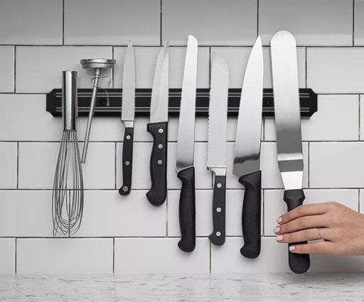 - Magnetyczny stojak na noże zabezpiecza ostrza noży, ponieważ nie ocierają się o siebie w szufladzie.