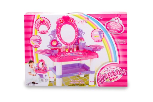 - Fantastyczna toaletka dla Twojej córki - Dzięki niej poczuje się jak prawdziwa księżniczka. Wiele akcesoriów z pewnością zachęci dziecko do długiej zabawy. W zestawie znajduje się wszystko, czego będzie potrzebować mała stylistka.Toaletka, która ozdobi pokój małej księżniczki.