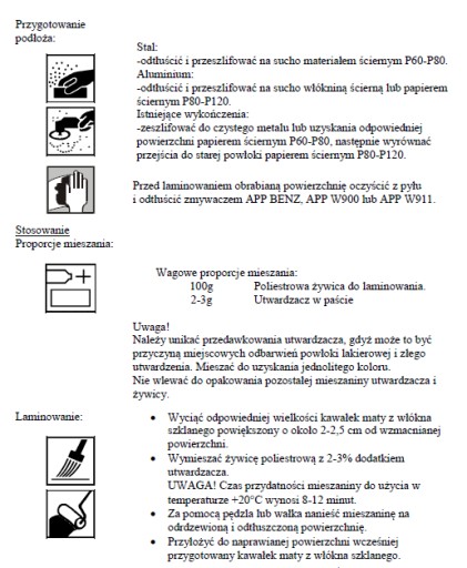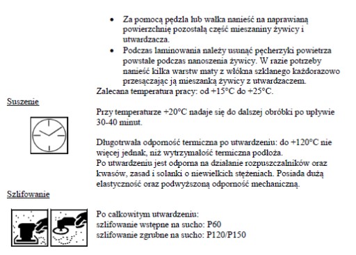 Po wyschnięciu żywicy, wyrównać za pomocą szpachlówki poliestrowej i obrabiać mechanicznie lub ręcznie papierem ściernym o granulacji 80 - 120.