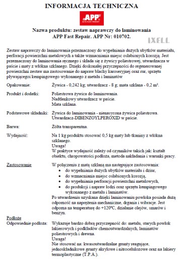 Zestaw naprawczy składa się z żywicy poliestrowej, utwardzacza w paście i maty z włókna szklanego.