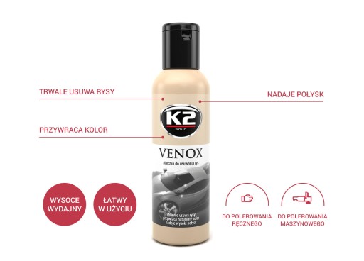 K2 VENOX to wysoce skuteczne mleczko do usuwania rys z powierzchni lakieru. Usuwa rysy trwale, zamiast tymczasowo je maskować, przywracając w ten sposób pierwotny blask lakieru. Usunięte za pomocą