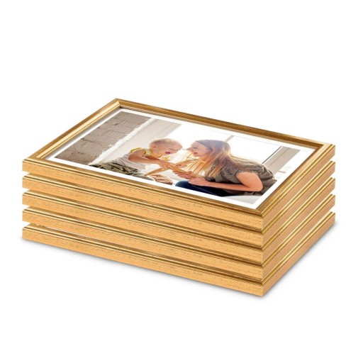 Fotoramki w kolorze złotym o przekroju profilu 11x12 mm wykonane w 100% z drewna. Pakiet ramek drewnianych jest doskonałą propozycją do ekonomicznej oprawy zdjęć, rysunków, druków. Ramki pakowane są w zestawie po 5 szt. Wyposażone są w szkło mineralne. Plecki wykonane są z twardej płyty HDF. Ramki na zdjęcia do rozmiaru 18x24 cm dodatkowo posiadają stopkę / nóżkę która pozwala eksponować oprawiony obraz na biurku lub regale. Pakiet ramek drewnianych DRWA F Z PAK dostępny jest w rozmiarach od 10x15 cm do 30x40 cm.
